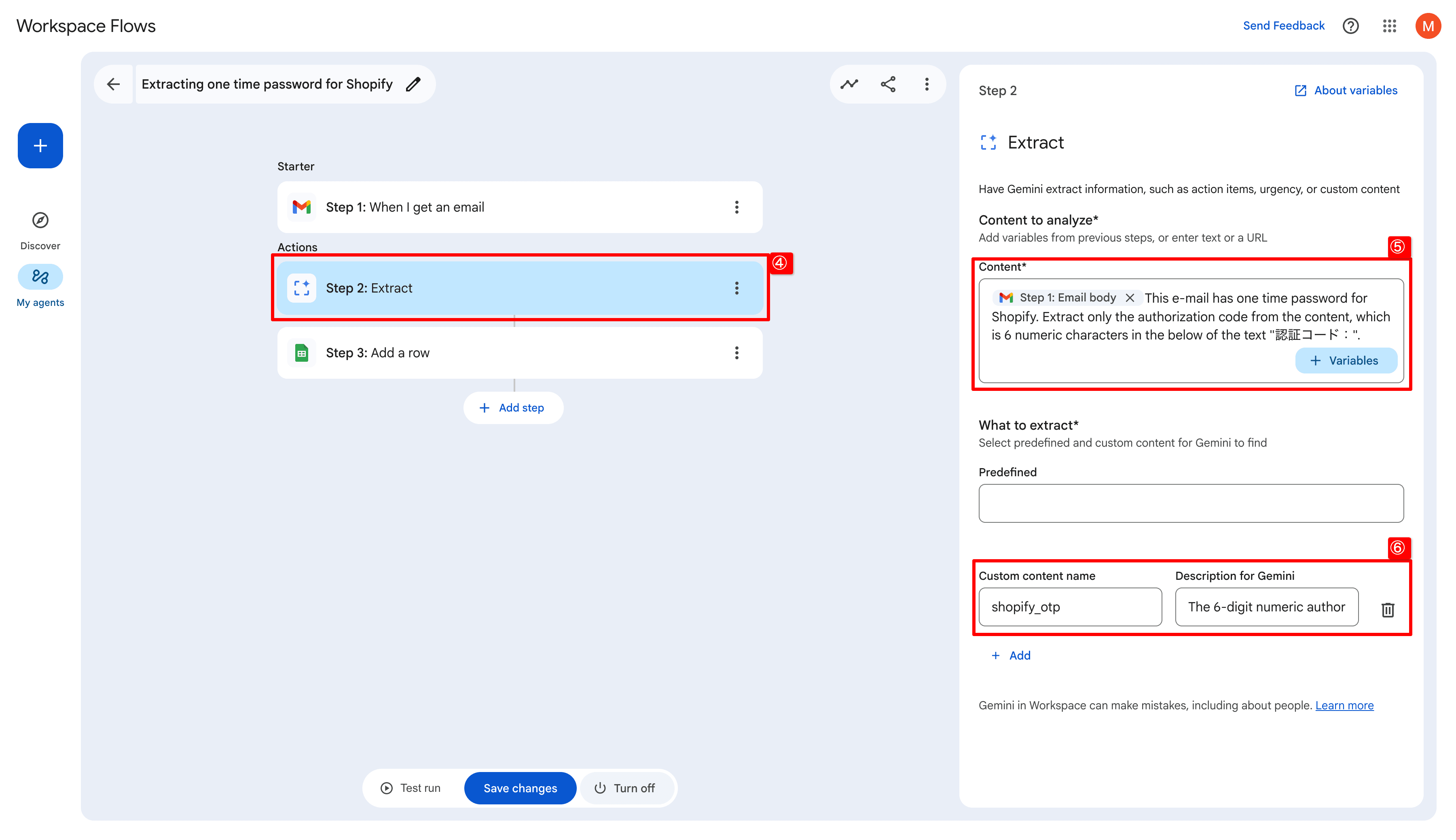 ⑤ 抽出条件として、メール本文から下記の条件で6桁のコードを取得