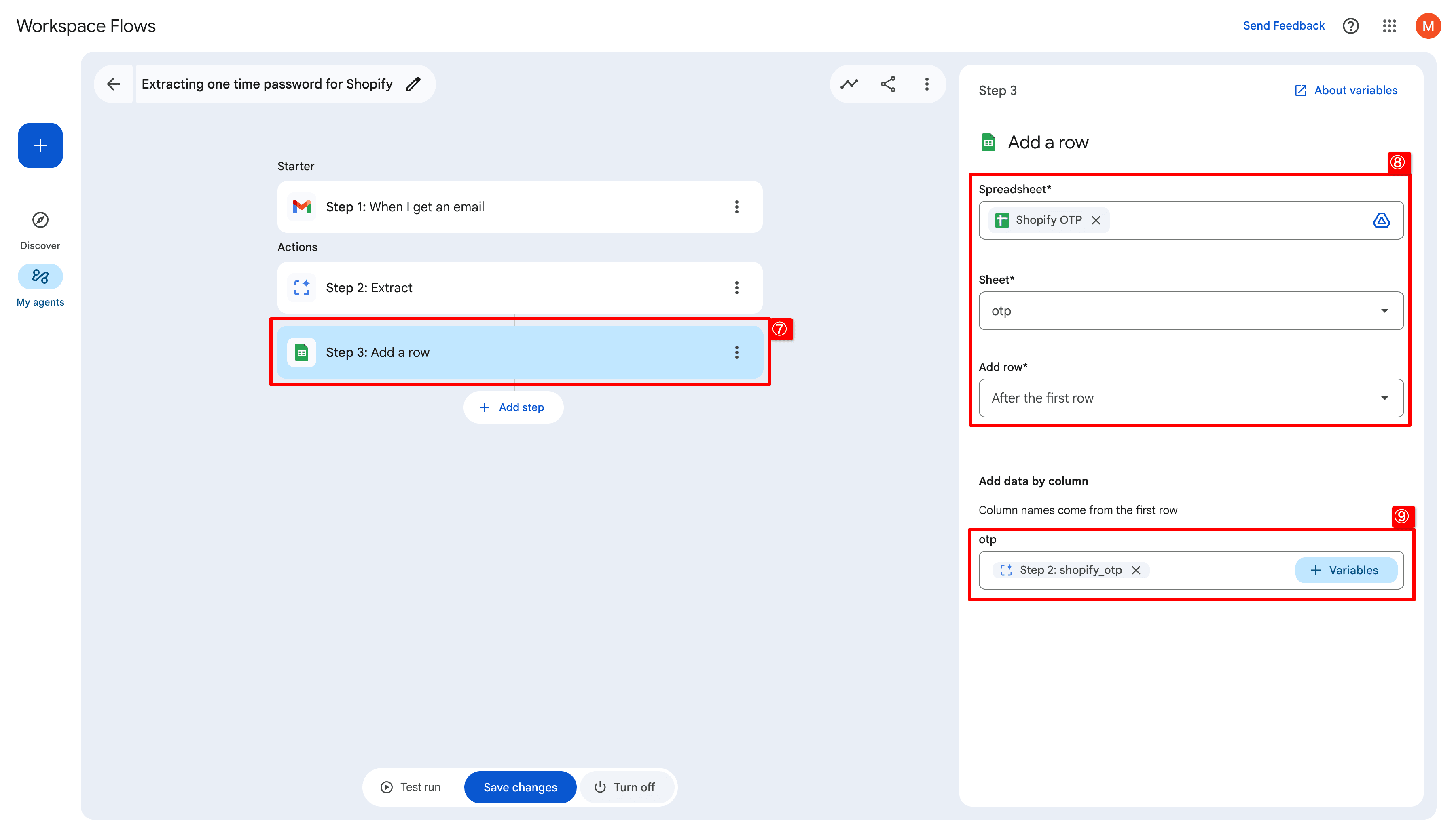 ⑥ 以降のActionで抽出したコードを利用するため変数名を指定。Descriptionは今回の場合、不要ですが、念のため6桁の数字を抽出するよう指定Custom content name = shopify_otp =