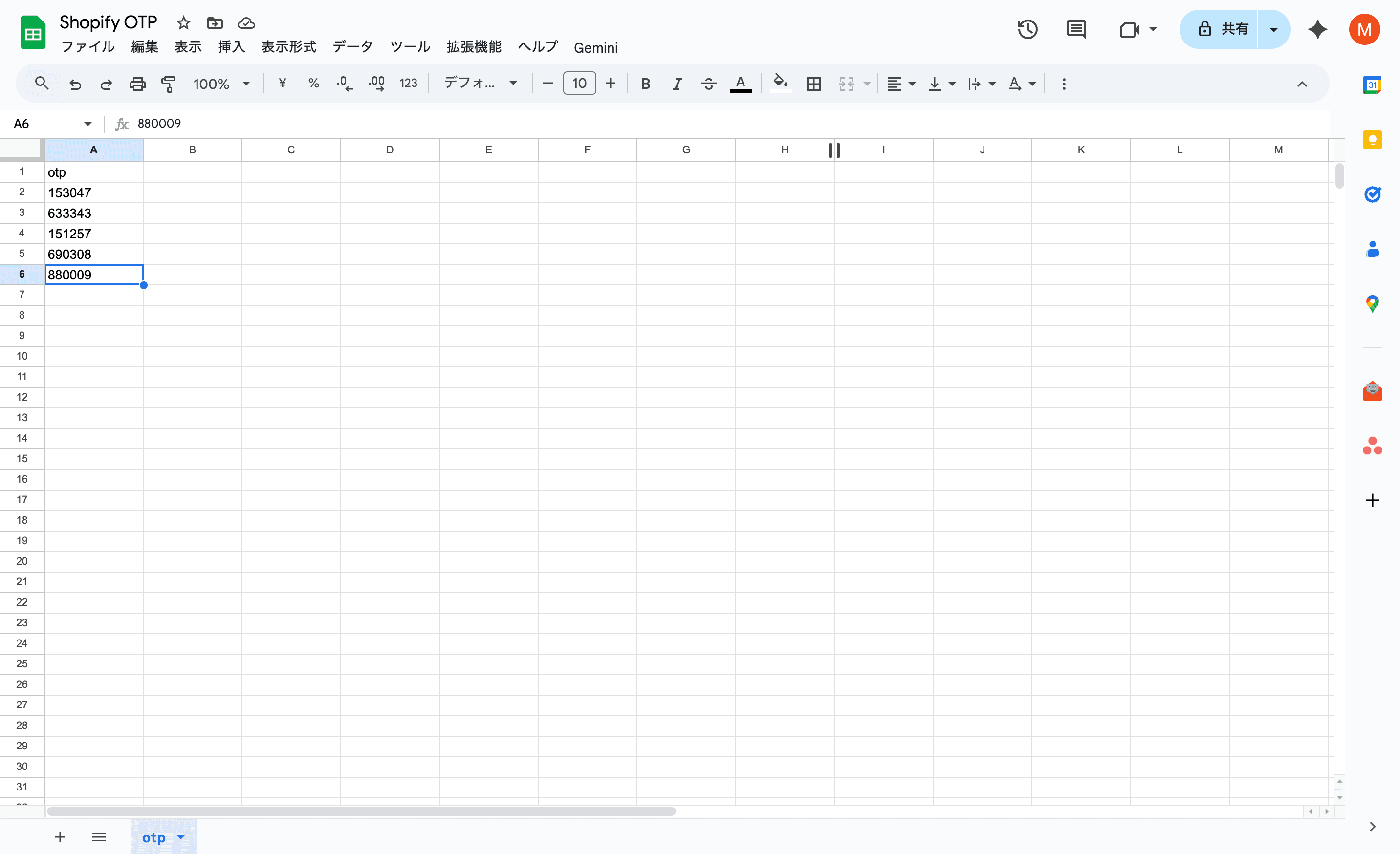 ワンタイムパスワードがGmailに届くたびに、上記のシートのA2セルに追加されていきます。(A2セルが最新のワンタイムパスワード)